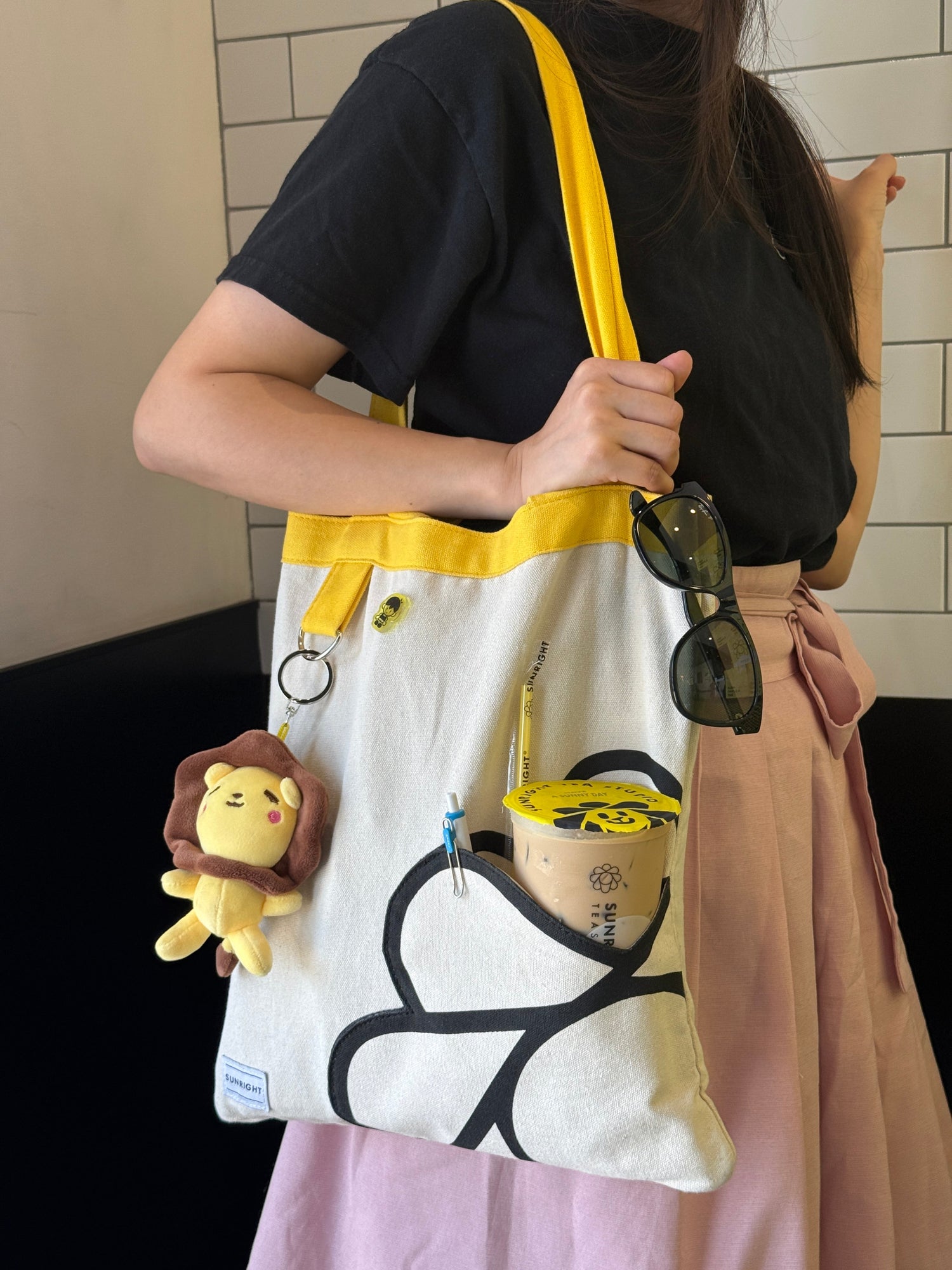 Roll out with our newest canvas bag! Equipped with a cute outer pocket modeled after our Sunright flower logo, it’s big enough to snuggly fit one of our drinks as you go about your day. With a double keyring feature, you can hang all your knick knacks with ease.